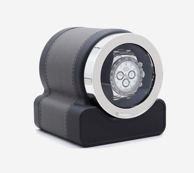 The Rotor 1 is the perfect compact watch winder. It is finished with a soft touch, mark resistant, high quality ABS plastic and offers 7 different coloured leather trim options. The motor mechanism is Swiss made and runs on batteries with a minimum autonomy of 3 years. Suitable to house both strap and bracelet models, this is the perfect universal watch winder.