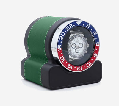 The Rotor 1 Sport is the perfect compact watch winder, with a bit of flare. Just as the Rotor 1 it is finished with a soft touch, mark resistant, high quality ABS plastic and offers 7 different coloured leather trim options. In addition, the window protection offers 5 various GMT inspired dial designs to choose from. The motor mechanism is Swiss made and runs on batteries with a minimum autonomy of 3 years. Suitable to house both strap and bracelet models, this is the perfect universal watch winder.